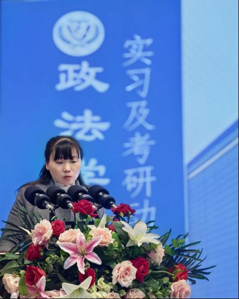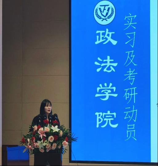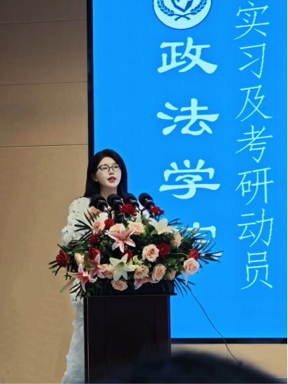 大会第三项,由政法学院公共管理系政治与公共行政教研室主任教师李婷婷作行政管理专业考研动员。她延续择校话题,围绕考研展开系统讲解,从择校决策、全程规划、心态调整三大维度切入,既传授了考研时间的合理分配与实用做题技巧,又着重强调了心态对备考的关键作用。备考过程中要保持规律作息,避免过度焦虑,学会通过运动、交流等方式调节情绪。她还特别指出,行政管理专业考研需注重政策敏感度与现实问题的结合,建议多关注时政热点,提升论述深度与逻辑表达。考研英语的复习应尽早启动,重点突破词汇积累与长难句解析,同时强化阅读理解的实战训练。她建议同学们每天安排固定时间进行英语学习,保持语感连贯性,并结合模拟考试检验成效,及时查漏补缺。最后,李老师寄语同学们:“考研不是短跑冲刺,而是一场有节奏的马拉松。稳住心态、按计划推进,终能成功上岸。”
