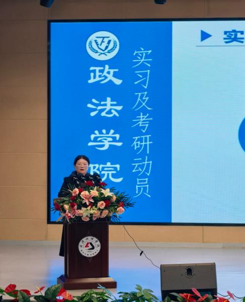 大会第二项,政法学院法学系理论法学教研室主任江莲老师作法学专业考研动员。她首先为同学们剖析了法学专业学生的常见问题,随后聚焦法学考研核心问题展开讲解:在择校环节,她特别提醒同学们避免盲目冲刺名校,需理性规划,要结合自身实力与职业规划选择目标院校,切忌跟风盲从;在备考策略上,她强调基础知识的扎实掌握是根本,真题训练与时间管理同样关键。她建议同学们制定科学的复习计划,分阶段推进,保持良好心态,避免焦虑内耗。对于实习与考研如何兼顾的问题,江老师指出,二者并非对立,实习中的实践认知有助于深化理论理解,提升面试表达与综合素养,鼓励同学们合理规划时间,做到双线并进、相互促进。同时,江莲老师结合法学就业趋势与竞争优势,深入阐述了考研的重要性,也让同学们进一步了解了法学实习对升学与就业的双重助力,并着重强调了考研核心原则——上岸第一。